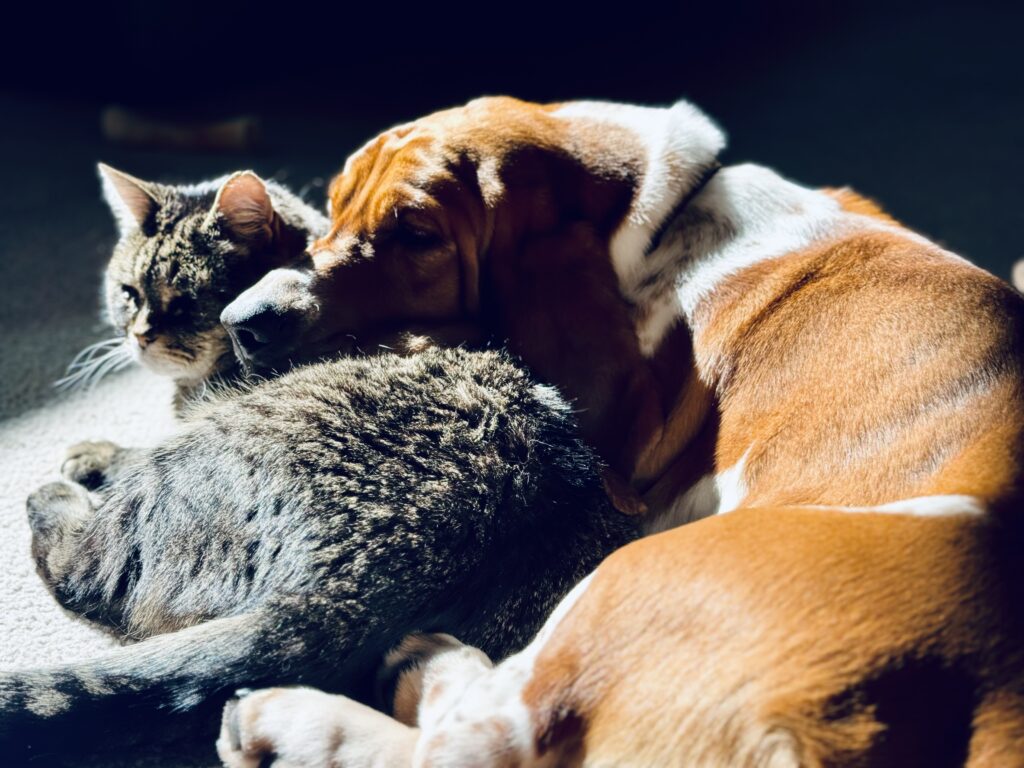 Gorbi, my post‑pandemic “COVID Dog,” is shown here curled up with his favorite cat companion, soaking in the sunlight streaming through the window. Their quiet moment together reflects the emotional resilience many dogs developed during the pandemic, as well as the comfort they found in familiar relationships while navigating disrupted routines and changing environments.